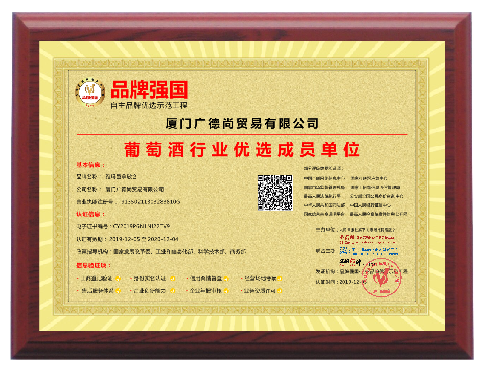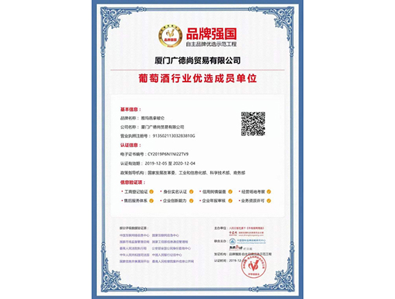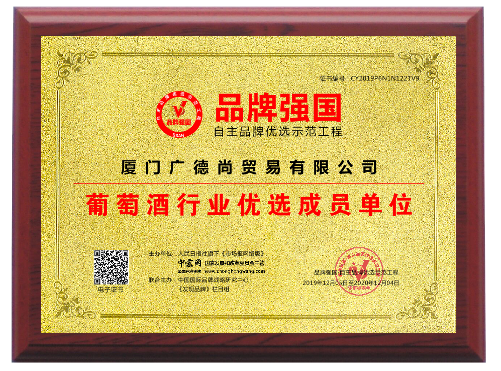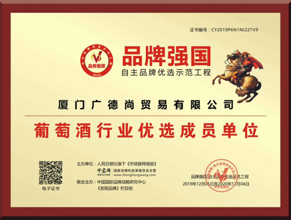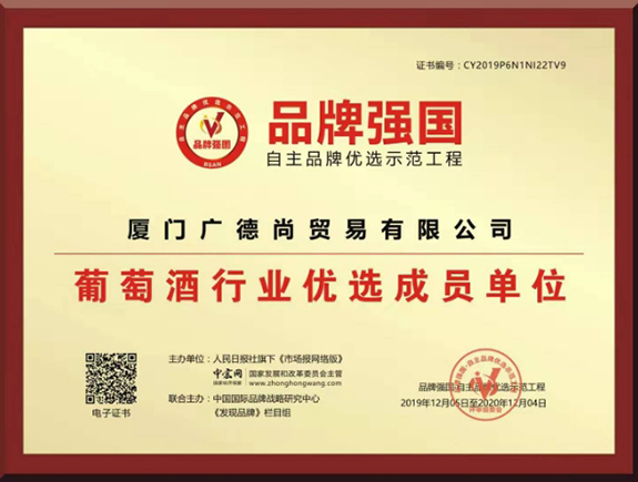 廈門廣德尚貿易有限公司坐落于福建美麗的鷺島廈門市杏林灣營運中心,公司始終堅持對品質的不屑追求,銷售的每一款紅酒都是經過專業品酒師精挑細選,堅持原裝原瓶自產地直接進口,并儲藏于大型恒溫倉庫,通過在溫度,濕度,光線及通風等完善的存儲條件下,以確保每一瓶酒的質量。我們所經營的葡萄酒均直接從法國酒莊原瓶進口而來,真正做到葡萄釀造者與合作伙伴之間的無縫對接。公司產品品質優異,性價比高,產品種類齊全,供應量充足,具有強勁的市場競爭力。目前公司運營的“雅瑪邑拿破侖葡萄酒、XO、利布爾納拉圖、愛爾斯天鵝、漢唐醬魂系列白酒、時光隧道啤酒”等品牌均以入選這中央電視臺品牌強國欄目上榜品牌。
